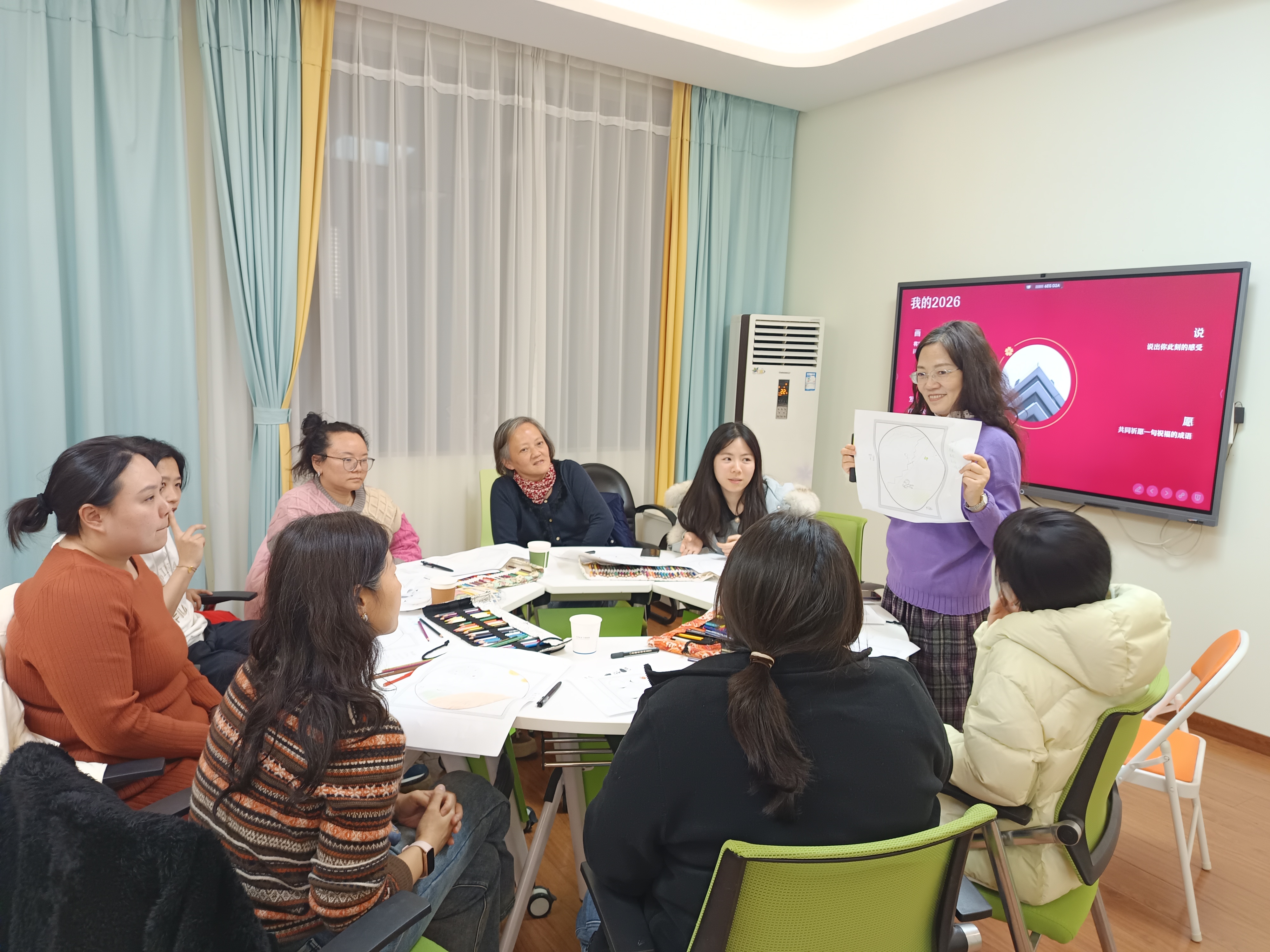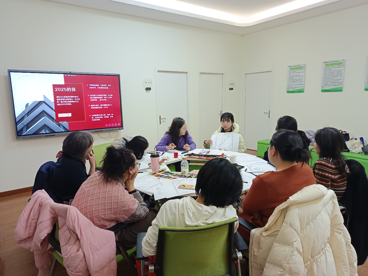 帶著對過去的梳理與整合,畫筆移至圓紙右側(cè)。老師引導大家描繪希望在2026年發(fā)生、或已在2025年萌芽的美好畫面。畫畢,大家用“滿足”“欣慰”“平靜”“喜悅”“激動”等積極的情緒詞匯為自己的畫作命名并寫下感受。在隨后的“壓力故事與支持需求”分享中,大家交流了壓力來源,表達了對“空間”“自我穩(wěn)定”“獨處”“被理解”等不同形式支持的渴望。無論是通過自我成長還是從關系中汲取養(yǎng)分,每個人都在努力構建自己的心理韌性,這份共同的努力令人感動。