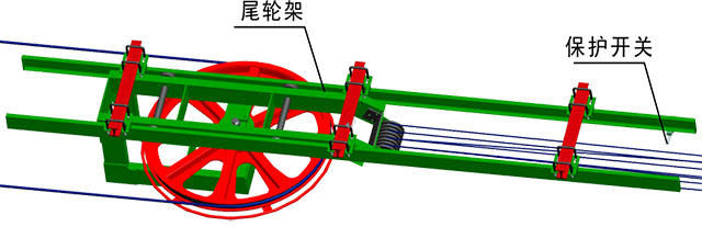 尾輪移至極限位置時,系統(tǒng)會報警并停車,提醒更換鋼絲繩。避免因牽引鋼絲繩過度伸長,導致張緊力下降而引發(fā)的打滑、飛車等安全事故的發(fā)生。