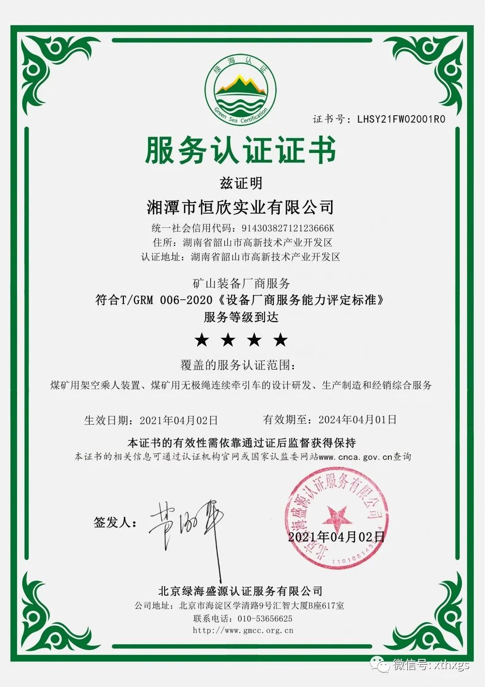 xiao12666@163.com【湘潭恒欣】被認(rèn)定為礦山裝備廠商服務(wù)四星級企業(yè)