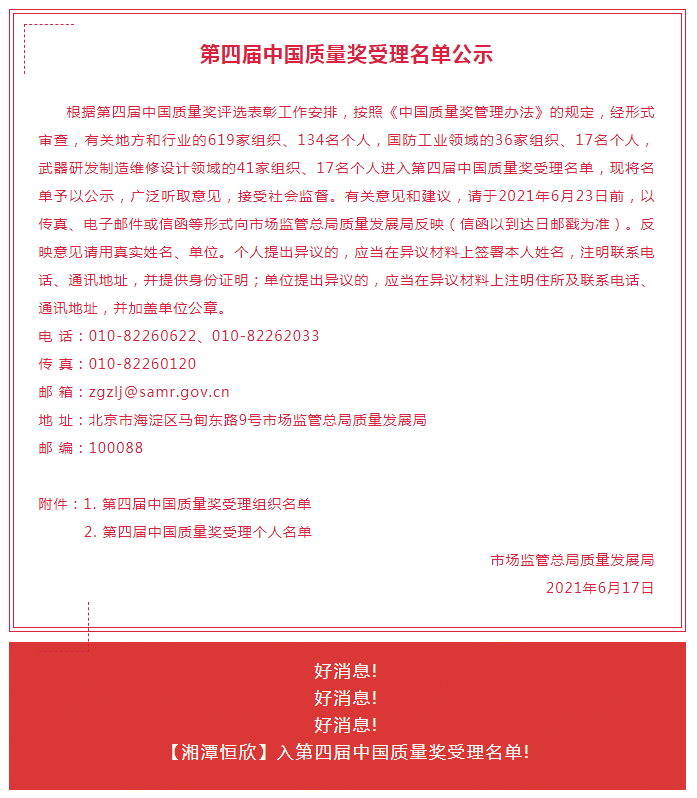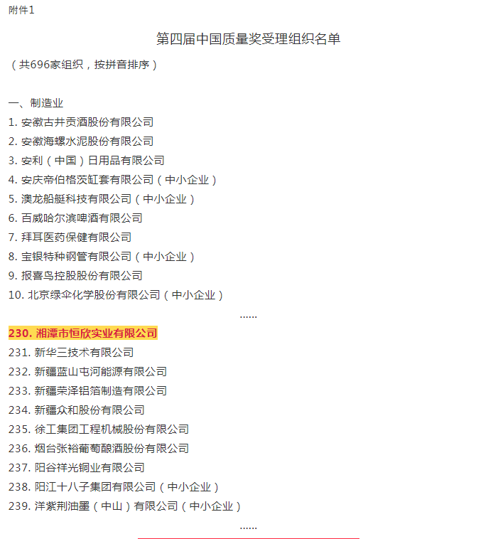 xiao12666@163.com【湘潭恒欣】入第四屆中國質(zhì)量獎受理名單