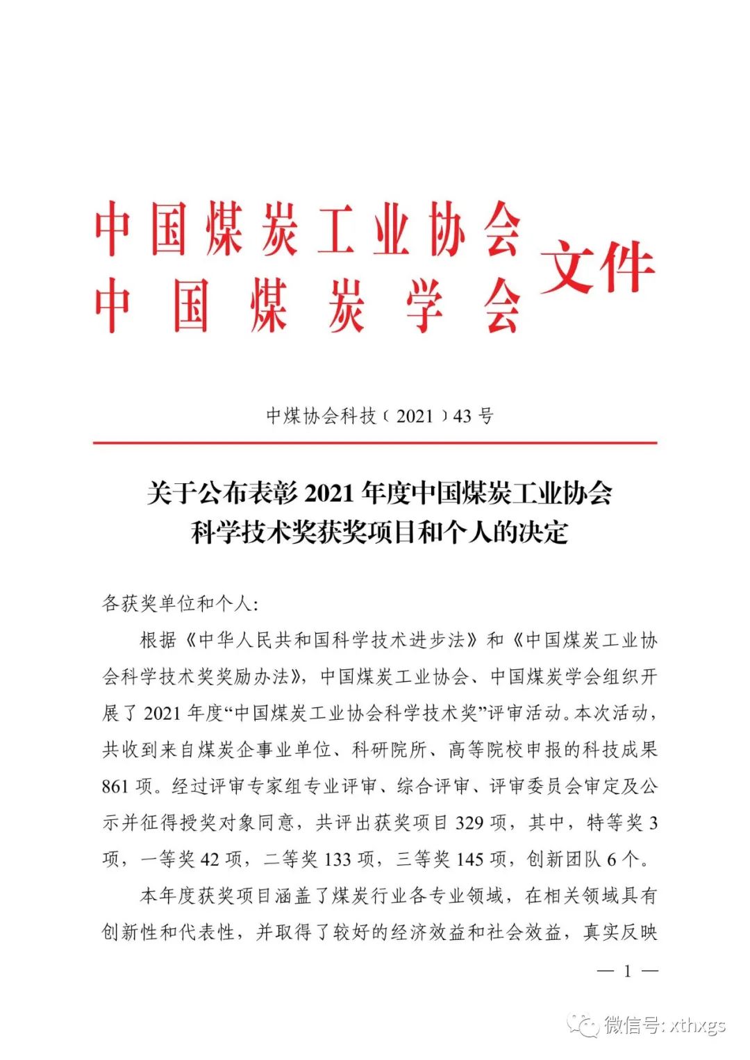 【湘潭恒欣】喜獲中國煤炭工業(yè)科學技術一等獎
