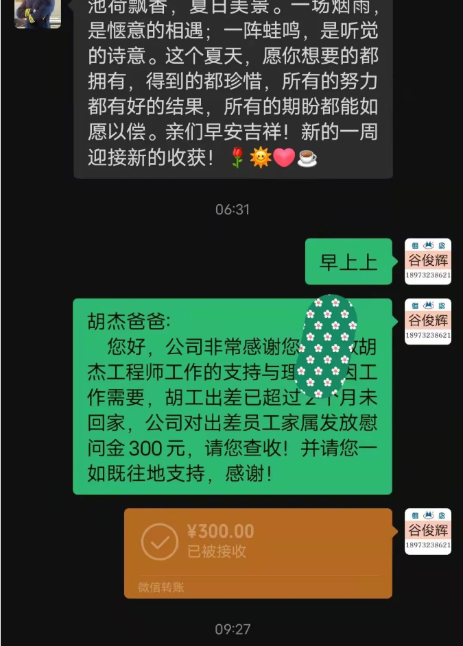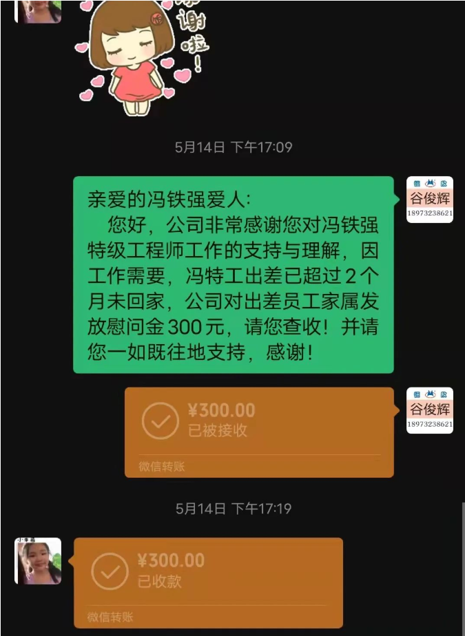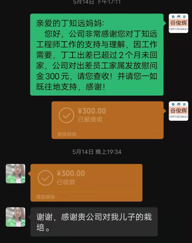 【湘潭恒欣】為了感謝售后服務(wù)工程師們的家屬對(duì)其工作的支持,及長(zhǎng)期出差不能照顧家庭的理解,除在重要日子對(duì)其家屬們送去祝福和問(wèn)候外,還會(huì)對(duì)出差超過(guò)2個(gè)月以上的售后服務(wù)工程師們的家屬發(fā)放慰問(wèn)金。