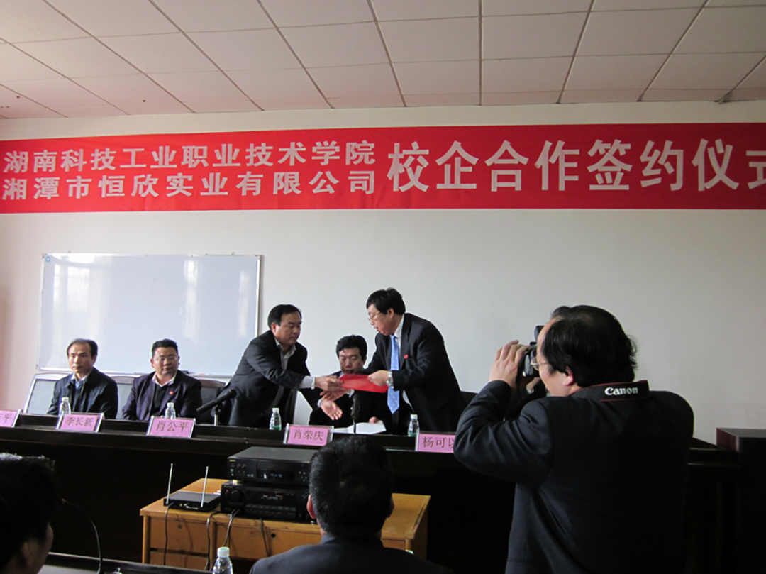 2011年3月31日,在韶山市領(lǐng)導(dǎo)的見證下,我公司與湖南科技工業(yè)職業(yè)技術(shù)學(xué)院簽訂了校企合作協(xié)議書,校方為我公司人才培養(yǎng)基地,為我公司培養(yǎng)所需求的人才;我公司在校方設(shè)立“恒欣”班,并為其提供獎學(xué)金和愛心基金。