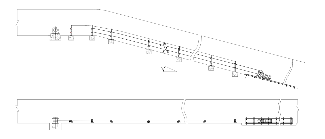 無極繩絞車帶動鋼絲繩無極循環(huán)運行,行人將卡繩棒卡住上山運行的鋼絲繩,并由上山運行的鋼絲繩將人拖動向上助力上坡,從而減輕礦工斜井上坡時的體力消耗,但下坡時禁止使用助行器。