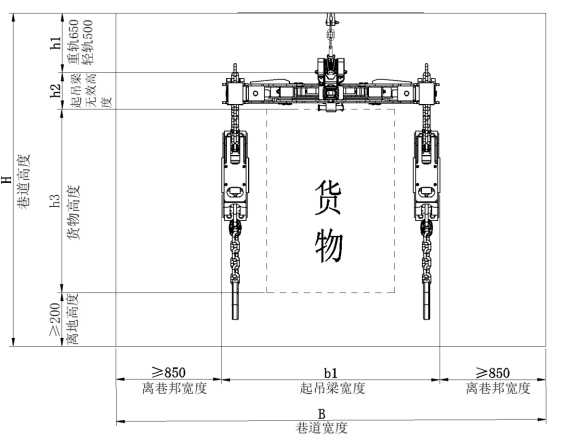 方式一:起吊梁位于中間位置,適用于巷道空間充足的運(yùn)輸情況,司機(jī)開車時視野開闊,采用葫蘆起吊梁,也可拆解為小噸位起吊梁,用于運(yùn)輸平板車、礦車等小型貨物。