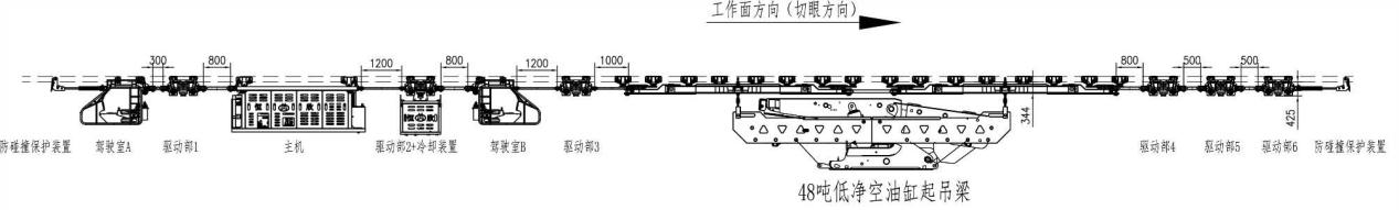方式二:起吊梁位于最前端位置,適用于直接將液壓支架運(yùn)輸?shù)焦ぷ髅媲醒畚恢眠\(yùn)輸方式,采用低凈空油缸或葫蘆起吊梁,常用于大噸位液壓支架運(yùn)輸。
