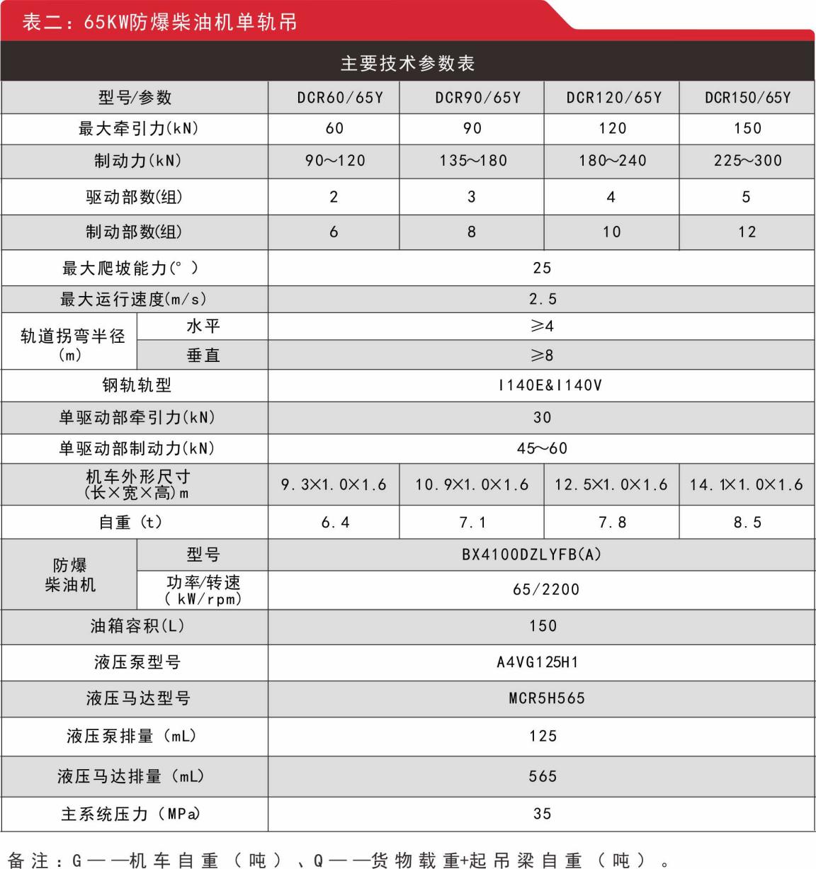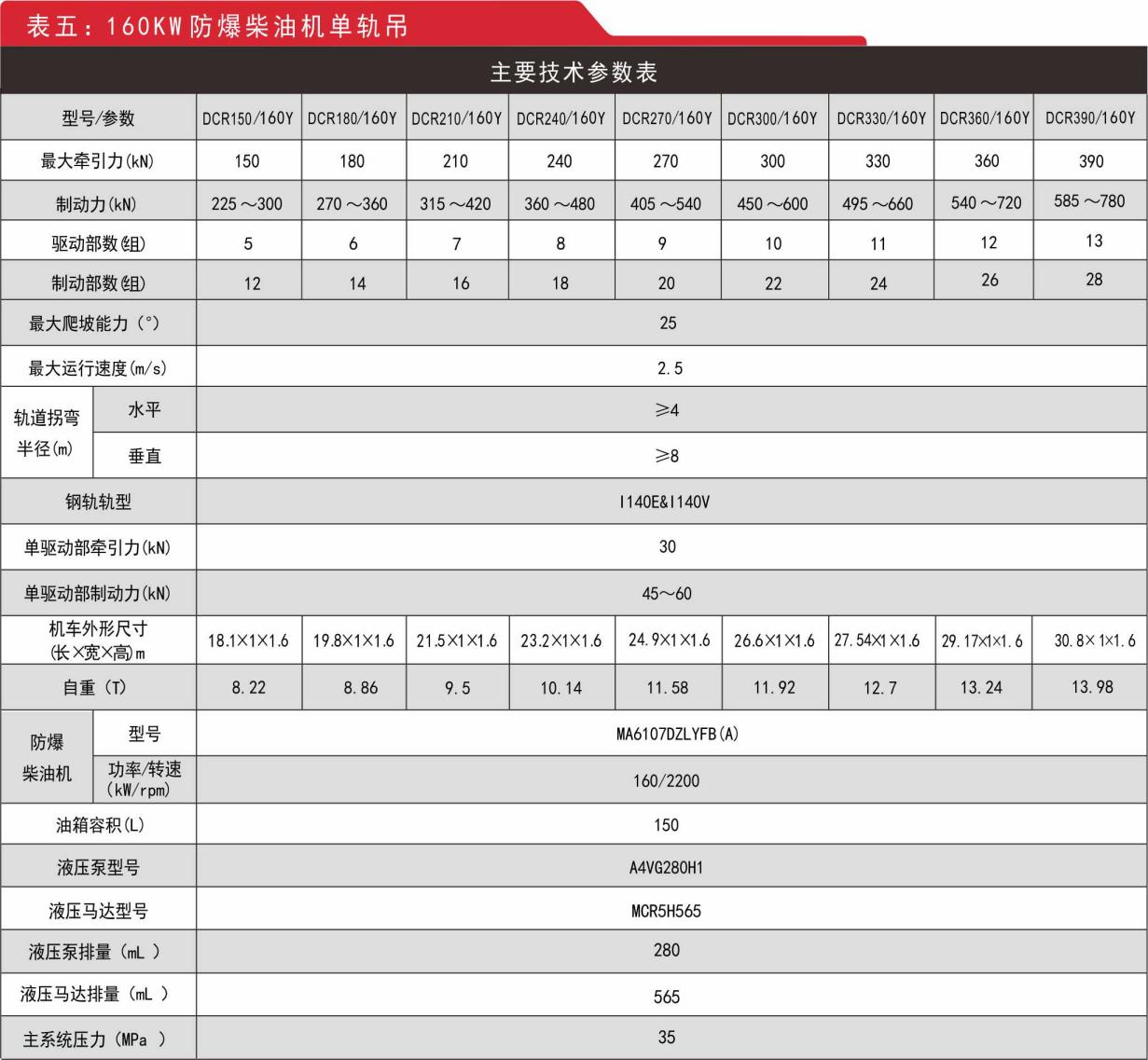 示列:型號(hào)DCR390/160Y,表示額定牽引力390KN,柴油機(jī)功率160KW,柴油機(jī)動(dòng)力液壓驅(qū)動(dòng)單軌吊機(jī)車。
