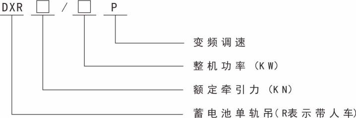 示列:型號DX120/72P表示額定牽引力120KN,整機(jī)功率72KW電機(jī)驅(qū)動的蓄電池單軌吊機(jī)車。