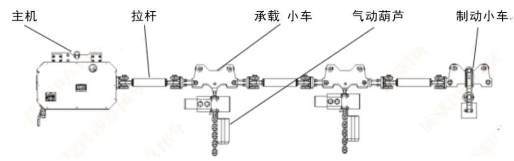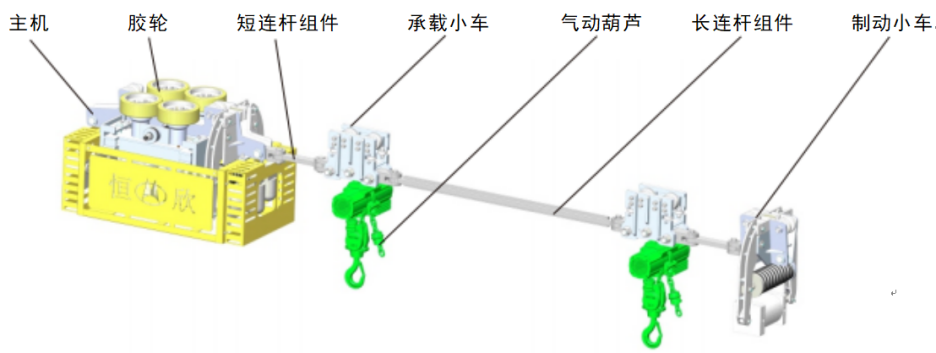 礦用氣動單軌吊機車主要由驅(qū)動裝置 、承載小車 、制動車 、氣動葫蘆 、拉桿 、氣動系統(tǒng) 、安全保護等組成 。 以壓縮空氣為動力源 ,驅(qū)動氣動馬達帶動膠輪或齒輪在軌道上運行 。適用于短程區(qū)間調(diào)度或掘進巷道的接力運輸;設備不產(chǎn)生廢氣 ,更適合通風條件差的工況 。通過操作手柄跟隨設備運行作業(yè) 。主要用于煤礦井下采掘工作面上下端頭巷道超前支護的物料 、設備的運輸 ,也可用于井下其它需要短距離運輸?shù)墓r。