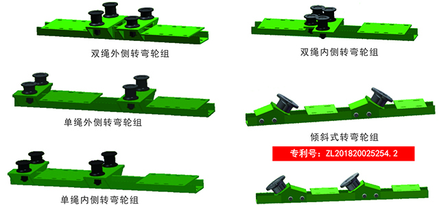 單繩內側轉彎輪組和傾斜式轉彎輪組。
