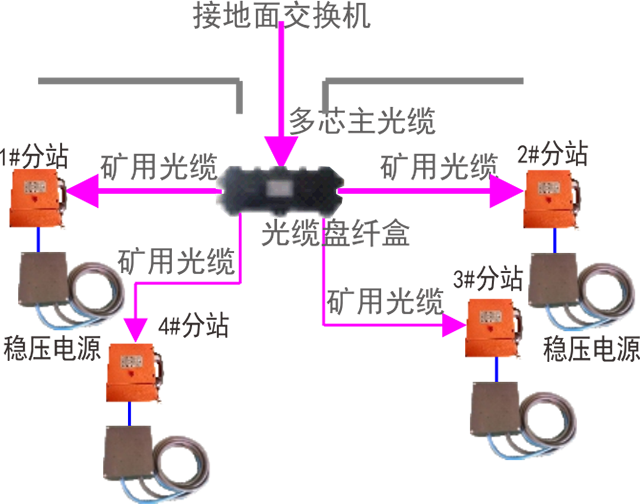 ◆ 如圖所示,分站利用一根礦用光纜總體連接至地面交換機、井下環(huán)網交換機。